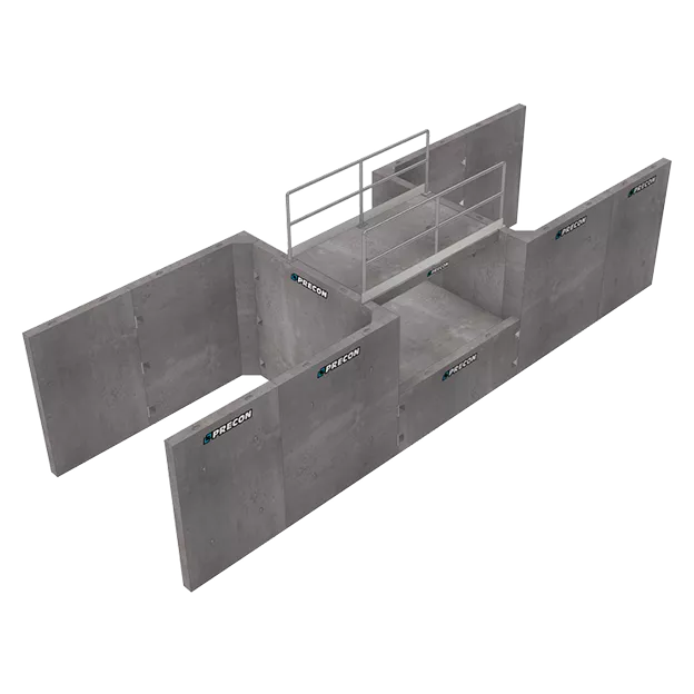 Precon’s Check structure controls water levels and velocity while measuring the flow, specifically when there is no change in elevation. Structures are multi-piece (typically 9-13) and assembled on-site in the shape of an ‘H’, perpendicular to the flow of water, which creates a double wall water cut-off, preventing bank erosion and seepage.